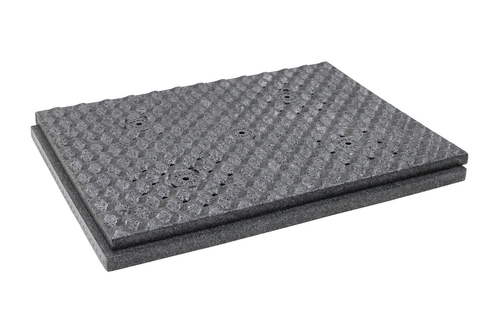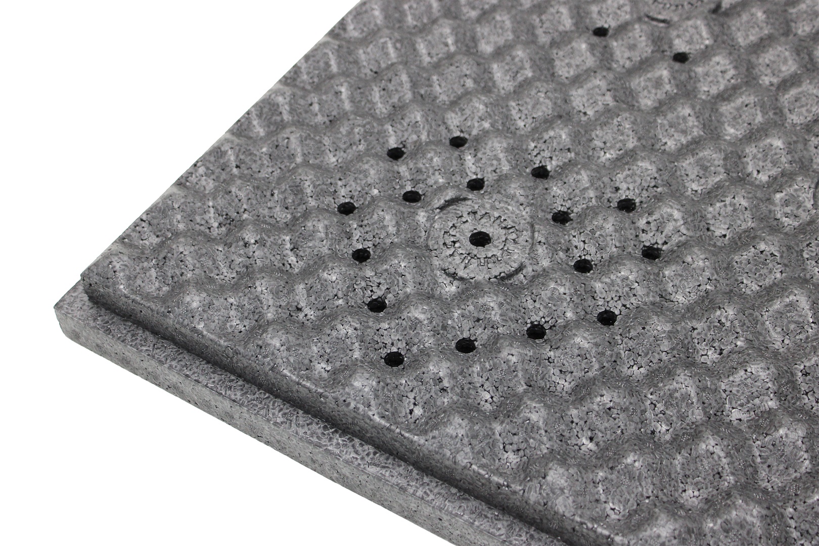 Уникальная конструкция с резонирующей перфорацией рассеивает звук и эффективно поглощает ударный и воздушный шум как внутри помещения, так и от соседей сверху